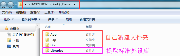 除了标准外设库文件之外,我们需要建立存放自己代码的文件和文件夹。我这里主要需要新建三个文件夹: