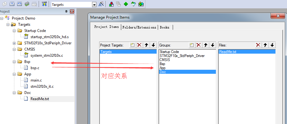上面两个步骤完成之后,我们就可以看到在“STM32F103ZE(Keil)_Demo”下面整理的文件夹: