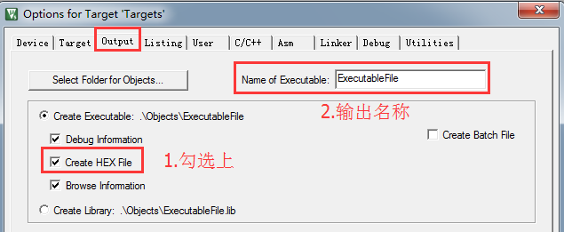 很多朋友初学的朋友都会问怎么输出Hex(可直接下载的文件),只需要勾选上【Project -> Options for Target -> Output】“Create HEX File”即可。