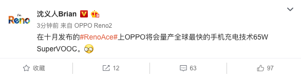 今日沈义人透露了该机的一项特点,支持65瓦SuperVOOC快速充电技术。