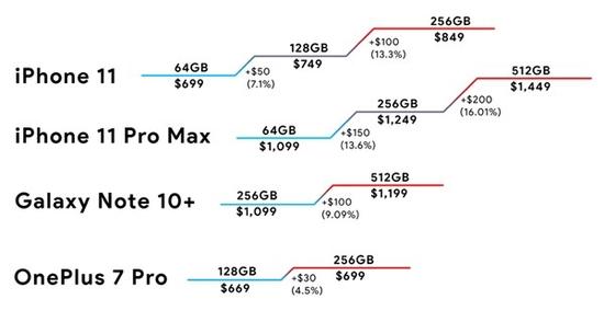 Phone Arena也搬出了安卓设备的对比数据:其中三星Galaxy Note 10+ 256GB与512GB版价格相差100美元,一加7 Pro 128GB与256GB版价格相差仅30美元,前者起步存储容量为256GB,后者为128GB。