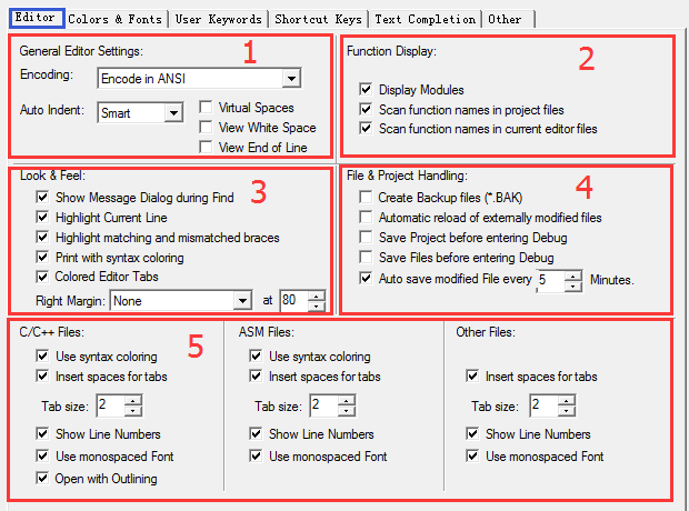 我将Edit分为五部分来讲述,分为General Editor Settings、Function Display、Look & Feel、File & Project Handing、C/C++ & ASM & Other File五个部分,如下图: