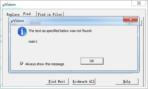 比如:我在main.c文件中查找main1(文件中实际是没有main1),勾选上就会弹出消息对话框(如下图),不勾选就不会弹出高亮对话框。