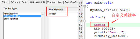 举例:我们定义C/C++类型关键字为“abcedf”,在编辑的时候就会显示关键字颜色。