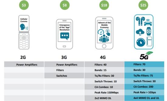 但进入最近几年,智能手机厂商做的手机越来越薄,全面屏也逐渐成为潮流,外壳材料也多了更多的选择;这就给智能手机射频的尺寸、功耗和天线提出了更大的挑战;5G的到来,带来了更高的频谱,更多技术(如4×4 MIMO)的引入,给射频器件厂商提出了更高的需求。还加上手机射频还需要向后兼容,这同样会让智能手机开发商的射频开发难度进一度提升;