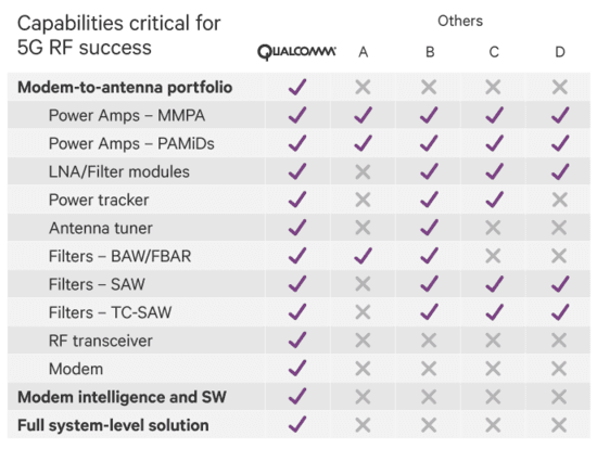 而在笔者看来,高通在这个市场市场的布局,也有他们先天的优势。因为他们在手机SoC市场拥有五成左右的份额,这就让他们在搭售射频前端的时候,拥有别人所不具备的便利。同时,正如前面所说,5G等新技术的出现,让手机的开发难度日益提升,如果高通能够total solution 从AP到基带再到射频的问题,这就降低了手机厂商的开发难度并加快了他们的商用流程,这何乐而不为?