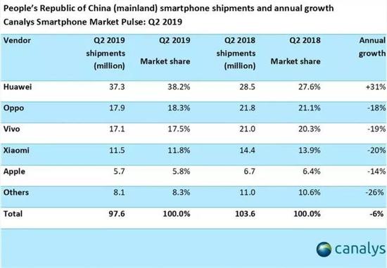 市场研究机构IDC的最新报告显示,今年第二季度全球智能手机出货量同比下降2.3%。出货量排名为三星7550万台、华为5870万台、苹果3380万台、小米3230万台、OPPO 2950万台。特别是处于舆论风口浪尖的华为,在国内市场更是铆足了劲。Canalys称,2019年Q2,华为手机在中国大陆的出货量为 3730 万台,市场份额占38.2%,位居第一,遥遥领先于后面的手机厂商。