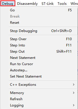 其中“Debug调试、Disassembly反汇编”两个菜单是在调试模式时才有的。“下载调试工具”是由你工程目标配置所决定的(上面截图是配置ST-Link)。