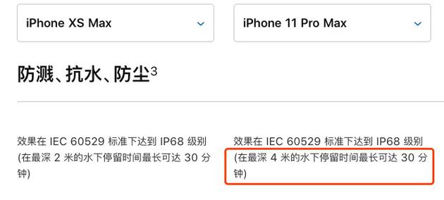虽然iPhone 11 Pro系列仍是IP68级别,但官网描述的防水性能已经从前一代的“在2米深的水下停留时间最长可达30分钟”增加到了“在4米深的水下停留时间最长可达30分钟”——我们仍旧需要再提醒一下,所有的手机即便防水也不是为游泳准备的。随着手机使用年限增长,防水性能也会逐步下降。而且几乎所有厂商都规定进水不保修。