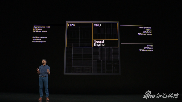 发布会上公布的账面数据:A13 Bionic集成85亿个晶体管,采用7nm工艺。依旧是2+4模式,2颗高性能核心,速度提升20%,功耗降低30%;4颗效能核心,速度提升20%,功耗降低了40%。Neural Engine神经引擎跟A12一样是8核,性能提升了20%,能耗降低15%。