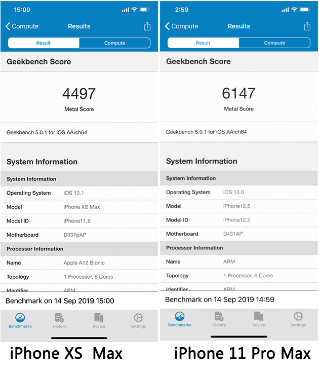 iPhone XS Max得分4497;iPhone 11 Pro Max得分6147
