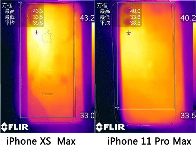 除了得分高了,新处理器的发热量也比过去降低了。经过两轮跑分后,用热成像仪观看两者后背,主要发热区域都在摄像头斜下方,但新iPhone发热量明显要小于上代产品,最高温度差了3度。