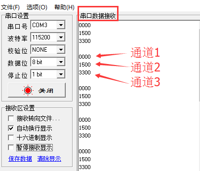 所以,我们转换保存的顺序:ADC_Buf[0]是通道1的数据、ADC_Buf[1]是通道2的数据、ADC_Buf[2]是通道3的数据