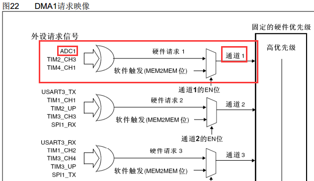 我们使用DMA通道是有要求的,需按照手册提供的规则来(如下图);请参看手册: