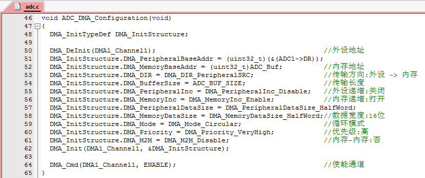 2.内存地址:DMA_MemoryBaseAddr =(uint32_t)ADC_Buf;