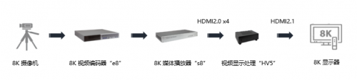 图:由e8视频编码器、s8媒体播放器及HV5视频显示处理器组成的视频直播系统