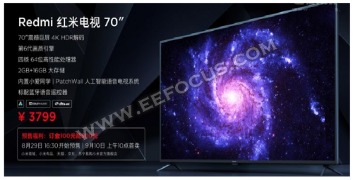 8月29日,在北京小米科技园举办的 Redmi新品发布会上,小米集团副总裁、红米Redmi品牌总经理卢伟冰发布了Redmi首款智能电视产品——70英寸Redmi红米电视。该款电视产品采用了“手机+AIoT” 双引擎战略,搭载了业界标杆的“PatchWall拼图墙”人工智能电视系统,致力于打造一套“电视+智能+内容”的完整生态,另外3799元的售价是一大竞争亮点之一。