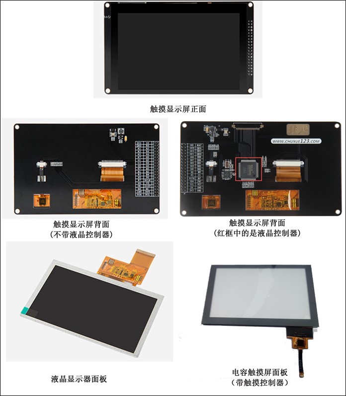 这个完整的显示屏由液晶显示面板、电容触摸面板以及PCB底板构成。图中的触摸面板带有触摸控制芯片,该芯片处理触摸信号并通过引出的信号线与外部器件通讯面板中间是透明的,它贴在液晶面板上面,一起构成屏幕的主体,触摸面板与液晶面板引出的排线连接到PCB底板上,根据实际需要,PCB底板上可能会带有"液晶控制器芯片"。因为控制液晶面板需要比较多的资源,所以大部分低级微控制器都不能直接控制液晶面板,需要额外配套一个专用液晶控制器来处理显示过程,外部微控制器只要把它希望显示的数据直接交给液晶控制器即可。而不带液晶控制器的PCB底板,只有小部分的电源管理电路,液晶面板的信号线与外部微控制器相连,直接控制。STM32F429系列的芯片不需要额外的液晶控制器,也就是说它把专用液晶控制器的功能集成到STM32F429芯片内部了,节约了额外的控制器成本。