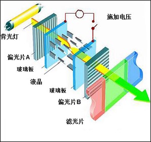 液晶是一种介于固体和液体之间的特殊物质,它是一种有机化合物,常态下呈液态,但是它的分子排列却和固体晶体一样非常规则,因此取名液晶。如果给液晶施加电场,会改变它的分子排列,从而改变光线的传播方向,配合偏振光片,它就具有控制光线透过率的作用,再配合彩色滤光片,改变加给液晶电压大小,就能改变某一颜色透光量的多少,图 272中的就是绿色显示结构。利用这种原理,做出可控红、绿、蓝光输出强度的显示结构,把三种显示结构组成一个显示单位,通过控制红绿蓝的强度,可以使该单位混合输出不同的色彩,这样的一个显示单位被称为像素。