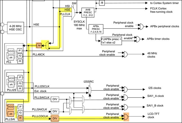 LTDC外设使用3种时钟信号,包括AHB时钟、APB2时钟及像素时钟LCD_CLK。AHB时钟用于驱动数据从存储器存储到FIFO,APB2时钟用于驱动LTDC的寄存器。而LCD_CLK用于生成与液晶面板通讯的同步时钟,见图 2712,它的来源是HSE(高速外部晶振),经过"/M"分频因子分频输出到"PLLSAI"分频器,信号由"PLLSAI"中的倍频因子N倍频得到"PLLSAIN"时钟、然后由"/R"因子分频得到"PLLCDCLK"时钟,再经过"DIV"因子得到"LCD-TFT clock","LCD-TFT clock"即通讯中的同步时钟LCD_CLK,它使用LCD_CLK引脚输出。