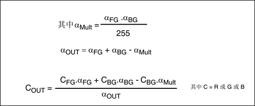 FIFO中的数据源经过PFC像素格式转换器后,前景层和背景层的图像都输入到混合器中运算,运算公式见图 2715。