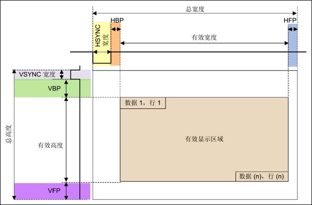 在这些时间参数控制的区域,数据使能信号线"DE"都为低电平,RGB数据线的信号无效,当"DE"为高电平时,表示的数据有效,传输的数据会直接影响液晶屏的显示区域。