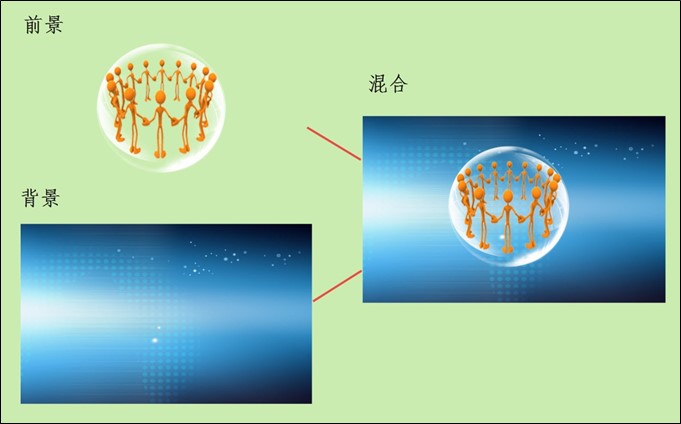 LTDC外设支持2层数据混合,混合前使用2层数据源,分别为前景层和背景层,见图 2710。在输出时,实际上液晶屏只能显示一层图像,所以LTDC在输出数据到液晶屏前需要把2层图像混合成一层,跟Photoshop软件的分层合成图片过程类似。混合时,直接用前景层中的不透明像素替换相同位置的背景像素;而前景层中透明像素的位置,则使用背景的像素数据,即显示背景层的像素。