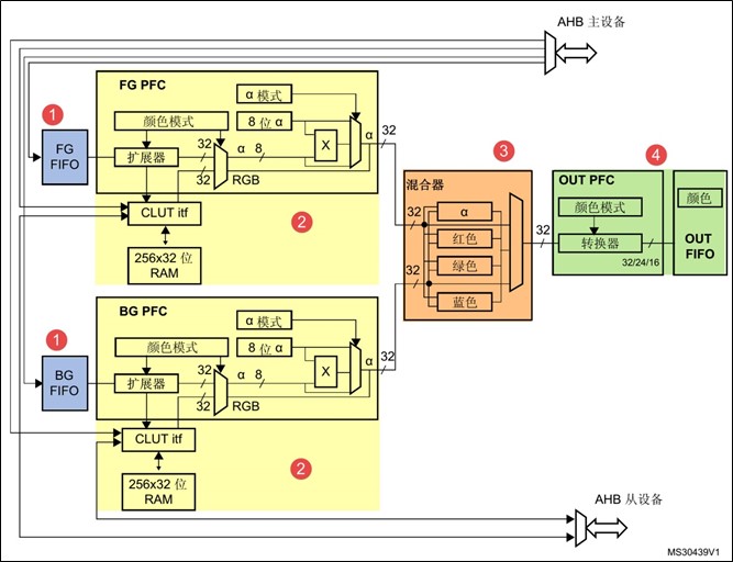 FG FIFO(Foreground FIFO)与BG FIFO(Backgroun FIFO)是两个64x32位大小的缓冲区,它们用于缓存从AHB总线获取的像素数据,分别专用于缓冲前景层和背景层的数据源。