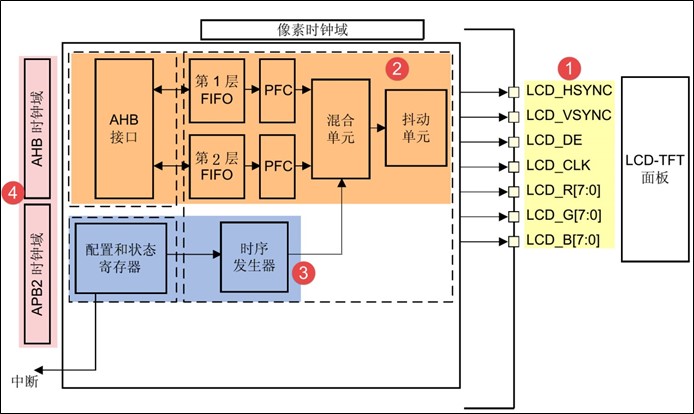 框图中标号表示的是LTDC的控制逻辑,它包含了LTDC的各种配置和状态寄存器。如配置与液晶面板通讯时信号线的有效电平、各种时间参数、有效数据宽度、像素格式及显存址等等,LTDC外设根据这些配置控制数据输出,使用AHB接口从显存地址中搬运数据到液晶面板。还有一系列用于指示当前显示状态和位置的状态寄存器,通过读取这些寄存器可以了解LTDC的工作状态。