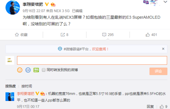 vivo NEX产品经理@李翔要增肥表示:“为啥刚看到有人在乱说NEX3屏幕?如假包换的三星最新的E3 SuperAMOLED啊,没啥别的可黑的了么?