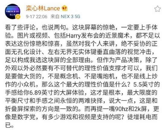 可能觉得说的有些不妥,@栾心林Lance很快将该条微博删除,你怎么看vivo NEX 3的屏幕?