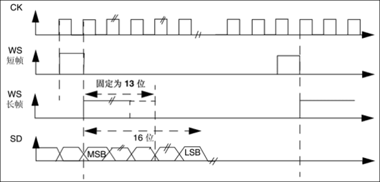PCM即脉冲编码调制,模拟语音信号经过采样量化以及一定数据排列就是PCM了。WS不再作为声道数据选择。它有两种模式,短帧模式和长帧模式,以WS信号高电平保持时间为判别依据,长帧模式保持13个CK周期,短帧模式只保持1个CK周期,可以通过相关寄存器位选择。如果有多通道数据是在一个WS周期内传输完成的,传完左声道数据就紧跟发送右声道数据。图 386为单声道数据16bit扩展到32bit数据帧发送波形。
