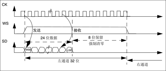 使用WS信号来指示当前正在发送的数据所属的通道,为0时表示左通道数据。该信号从当前通道数据的第一个位(MSB)之前的一个时钟开始有效。发送方在时钟信号(CK)的下降沿改变数据,接收方在上升沿读取数据。WS信号也在SCK的下降沿变化。参考图 383,为24bit数据封装在32bit帧传输波形。正如之前所说,WS线频率对于采样频率FS,一个WS线周期包括发送左声道和右声道数据,在图中实际需要64个CK周期来完成一次传输。