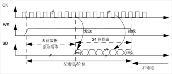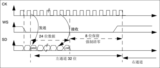 与左对齐标准类似,参考图 385,为24bit数据封装在32bit帧传输波形。