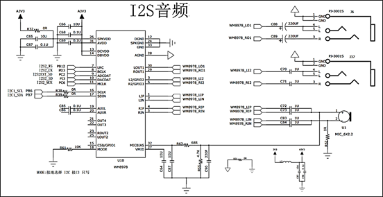 开发板板载WM8978芯片,具体电路设计参考图 3812。WM8978与STM32f42x有两个连接接口,I2S音频接口和两线I2C控制接口,通过将WM8978芯片的MODE引脚拉低选择两线控制接口,符合I2C通信协议,这也导致WM8978是只写的,所以在程序上需要做一些处理。WM8978输入部分有两种模式,一个是板载咪头输入,另外一个是通过3.5mm耳机插座引出。WM8978输出部分通过3.5mm耳机插座引出,可直接接普通的耳机线或作为功放设备的输入源。