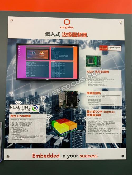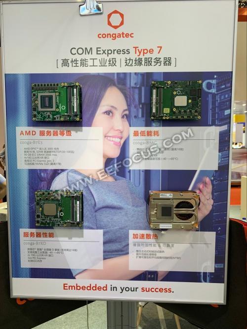 康佳特业务总监林美慧表示康佳特想展出的东西还蛮多的,今年展出的重点是嵌入式边缘服务器的部分,也就是嵌入式边缘及微型服务器的100瓦生态系统。康佳特在前年推出了COM Express Type 7服务器模块,在此基础上,今年加强了与AMD的合作,推出了搭载3GHz AMD EPYC Embedded 3000双芯(dual-die)处理器的conga-B7E3模块,支持最高100瓦的TDP、最多拥有16核与32线程。这款全球领先的100瓦服务器模块采用COM Express Basic规格尺寸95x125mm, 可以安装新式散热导片和热导管适配器,即使是最小的1U服务器也可获得高效的热导管冷却能力,这是本次展出的第一个亮点。