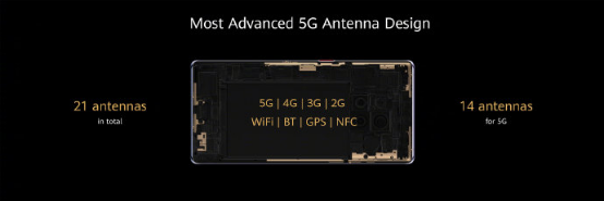 华为Mate 30系列手机内部集成了21根天线,其中14根天线用于5G连接,并支持8频段5G和双5G SIM卡连接。余承东称,华为Mate 30系列支持双VoLTE,在使用VoLTE通话的同时,另外一张卡可以同时支持5G上网。同时,华为Mate 30系列采用麒麟990 SoC集成了5G基带,并支持SA、NSA双组网。华为Mate 30系列支持5G n79、n78、n77、n41、n38、n28、n3、n1 8个频段的5G网络。