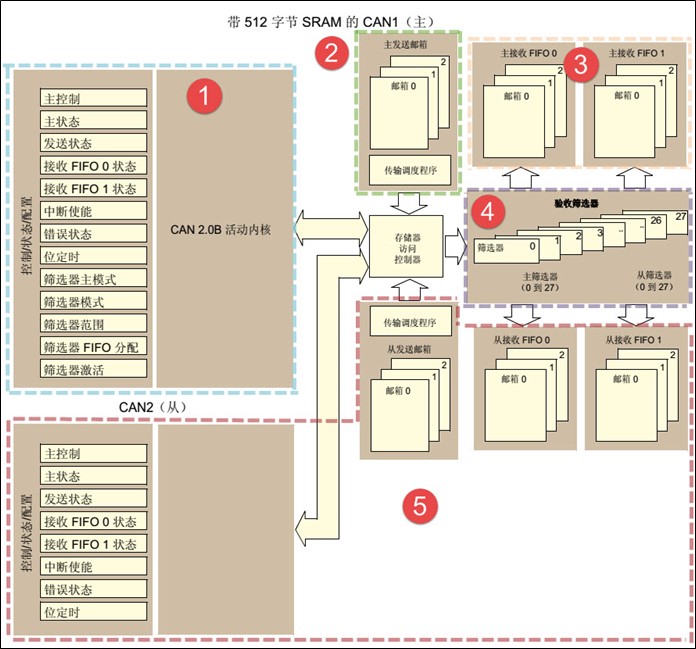 STM32的有两组CAN控制器,其中CAN1是主设备,框图中的"存储访问控制器"是由CAN1控制的,CAN2无法直接访问存储区域,所以使用CAN2的时候必须使能CAN1外设的时钟。框图中主要包含CAN控制内核、发送邮箱、接收FIFO以及验收筛选器,下面对框图中的各个部分进行介绍。