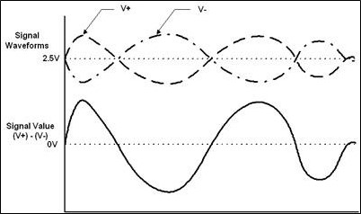 差分信号又称差模信号,与传统使用单根信号线电压表示逻辑的方式有区别,使用差分信号传输时,需要两根信号线,这两个信号线的振幅相等,相位相反,通过两根信号线的电压差值来表示逻辑0和逻辑1。见图 403,它使用了V+与V-信号的差值表达出了图下方的信号。