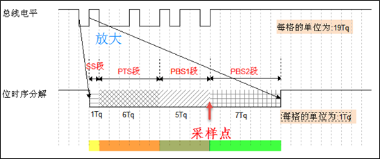 该图中表示的CAN通讯信号每一个数据位的长度为19Tq,其中SS段占1Tq,PTS段占6Tq,PBS1段占5Tq,PBS2段占7Tq。信号的采样点位于PBS1段与PBS2段之间,通过控制各段的长度,可以对采样点的位置进行偏移,以便准确地采样。