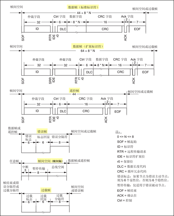 数据帧以一个显性位(逻辑0)开始,以7个连续的隐性位(逻辑1)结束,在它们之间,分别有仲裁段、控制段、数据段、CRC段和ACK段。