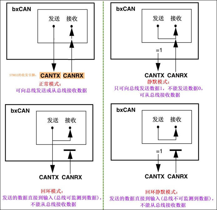 以上说的各个模式,是不需要修改硬件接线的,如当输出直连输入时,它是在STM32芯片内部连接的,传输路径不经过STM32的CAN_Tx/Rx引脚,更不经过外部连接的CAN收发器,只有输出数据到总线或从总线接收的情况下才会经过CAN_Tx/Rx引脚和收发器。