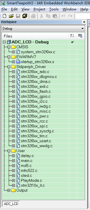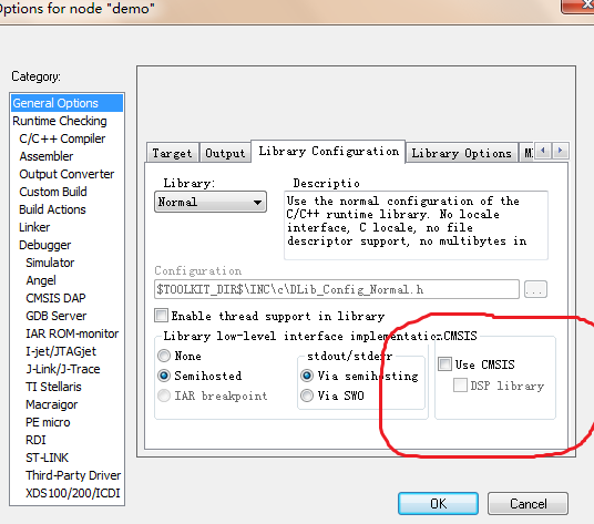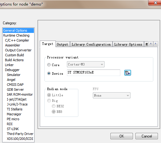 到此为止需要添加的文件已全部添加进来了,接下来是对IAR的配置,依旧是将鼠标放在左侧的工作空间上点击右键选择Options进行配置,在General Options-Target-Device选择自己使用的相应芯片型号,General Options下其他选项保持默认即可,