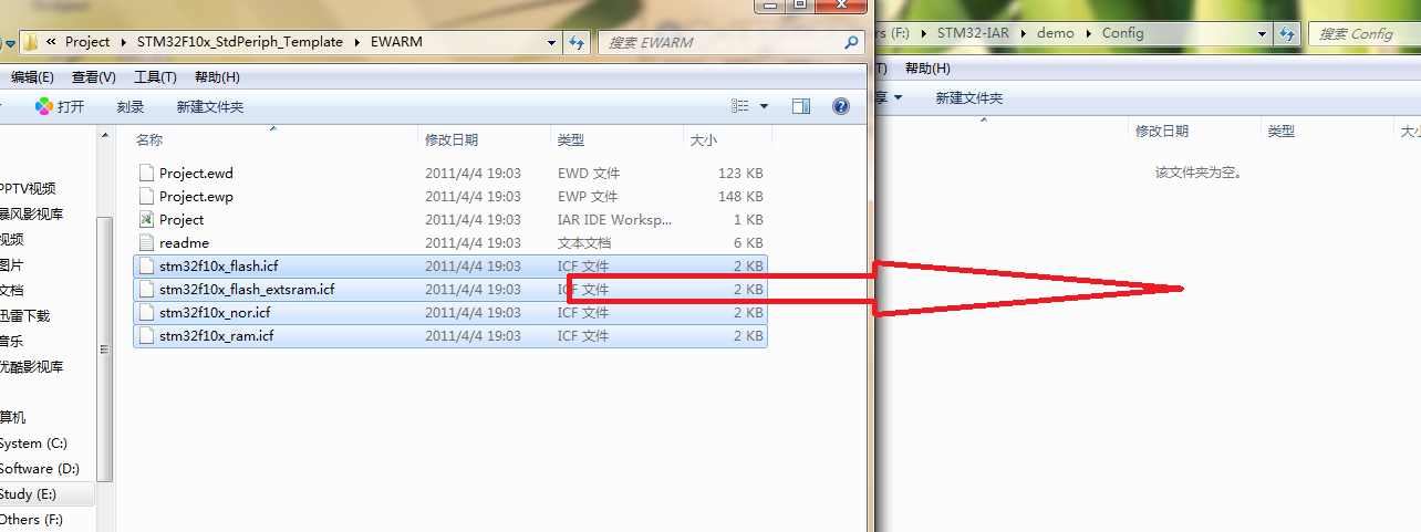 5、将固件库E:STM32stm32固件库3.5STM32F10x_StdPeriph_Lib_V3.5.0ProjectSTM32F10x_StdPeriph_TemplateEWARM目录下的.icf文件复制到模板目录F:STM32-IARdemoConfig中