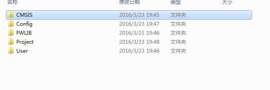 1、在常用的文件夹下新建立一个文件夹,根据个人喜好,分别建立如下几个文件夹,用于分别存放固件库中的文件和用户自己的文件