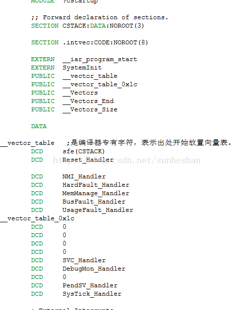 __vector_table是编译器专有字符,表示出处开始放置向量表。