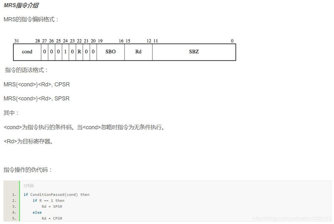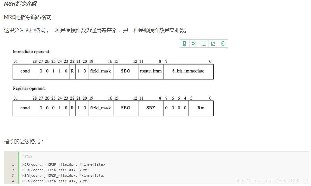 f: 指示bits[31 : 24],又名条件标志位域 s: 指示bits[23 : 16],又名状态标志位域 x: 指示bits[15 : 8], 又名扩展位域 c: 指示bits[7 : 0],又名控制位 指令的操作伪代码: