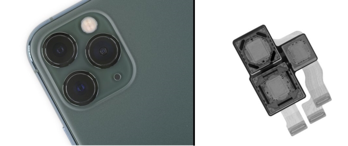 iPhone Pro Max的后置三摄像头被固定在了一起,每个相机都有各自独立的电缆。X射线呈现了摄像头的内部细节:黑条是OIS,其余的细小斑点几乎与去年的组件相匹配,对此iFixit团队猜测这枚后置三摄模块没有专用的RAM芯片。