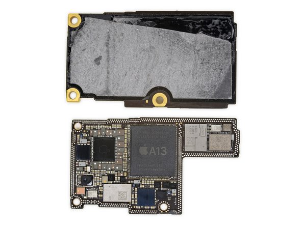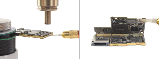 通过加热,仅撬开一点,顶板便从互连板上剥离。终于看到了传说中的A13处理器,以及大量分布在微型板上的其他芯片组件。