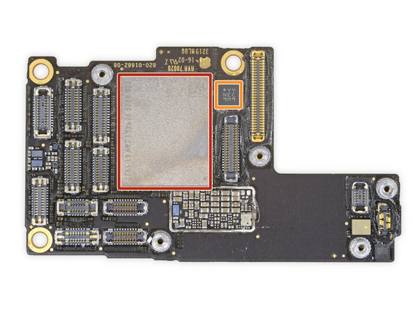 红色:苹果 APL1W85 A13仿生芯片叠在海力士H9HKNNNCRMMVDR-NEH LPDDR4X(看上去是4GB)上;